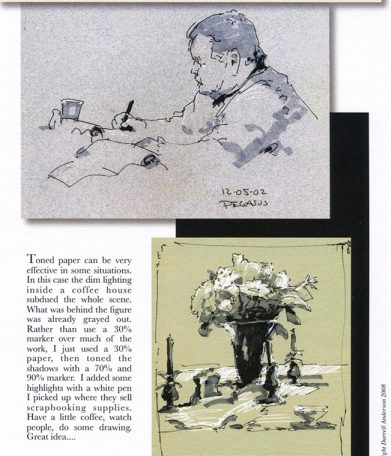 Make several different kinds of sketchbooks using standard sizes of paper. Have them cut to make a square format if you want. I use slightly textured papers for general sketching and a smoother paper for marker drawings. At least that’s the intent. In practice, however, all my books are filled with many techniques: watercolor, gouache, oil, pencil, charcoal, pastel, pen, and marker.