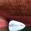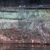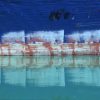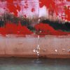The brightly painted hulls exhibit interesting patterns and textures which are reflected in the water. The hulls may appear delicate, tenuous, even transparent. However, the scrapes, gouges, rubber marks, and rusting wounds, sometimes from the ships’ own anchors, sometimes from the ubiquitous tires found on the sides of docks and tugboats, belie this frailty. At times a series of numbers or cryptic diagrams may appear on the massive hulls. These messages communicate only to those who assist in ferrying the ships in and out of the world’s ports.