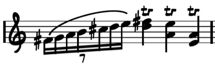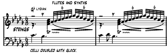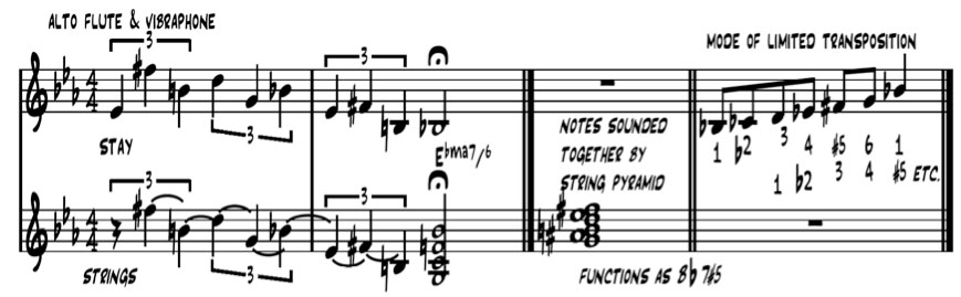 The orchestration of these notes is important to the effect Gibbs creates. Using a “cool” sound much favored by Brazilian composers(7), the triplets are played by alto flute and vibraphone in unison. In addition, the notes are doubled by the string section playing the triplets as a “pyramid.” In a pyramid, each note is played and held. By the eighth note, all eight notes are sounded and heard together forming a vertical cluster.