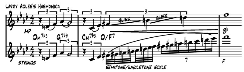 As this record must feature Adler, Gibbs has included a number of interludes and answering phrases for his harmonica. The following example works well with the strings. Adler’s harmonica style is defined by his phrasing—sliding into notes. Gibbs writes a line for him accompanied by violins that compliment this with a rising flurry of notes derived from the F semitone-wholetone scale over an F7 chord. This small example contains the following elements: