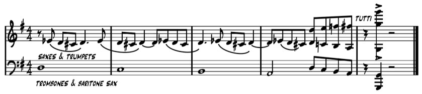 This up-tempo arrangement shows Gibbs writing in a style informed by both Dixieland jazz and Duke Ellington. In the extended ending, Gibbs uses an interesting four-note motif lasting three beats, displaced over the 4/4 meter so that it attacks on a different beat in the bar each time: