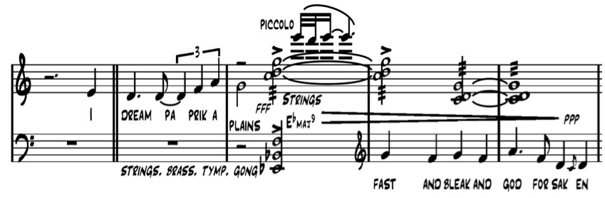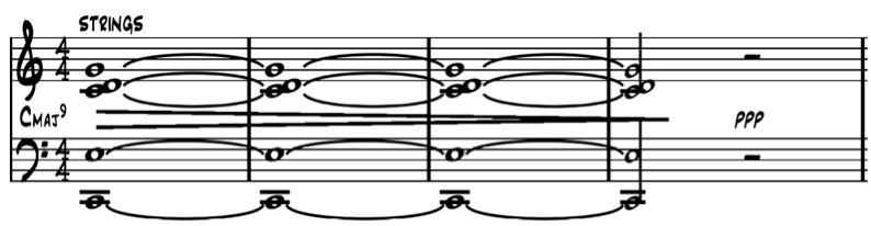 This attack is repeated and followed by a C major voicing lasting roughly twenty-three bars of an implied ¾ meter. This very wide voicing using strings, French Horns, and woodwinds has players crescendo and decrescendo at different times, creating an emotive, undulating effect. Gibbs explained how he achieved this.