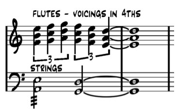 Gibbs accompanies Mitchell’s piano solo using various orchestral elements such as oboe, harp, flutes, tympani, horns, and high string voicings. He has had to decipher and reflect Mitchell’s often non-functional harmony and non-standard voicings. The following example shows a pan-diatonic approach using voicings in fourths.