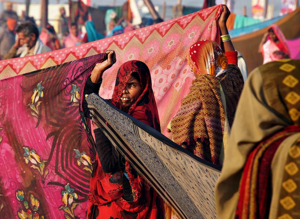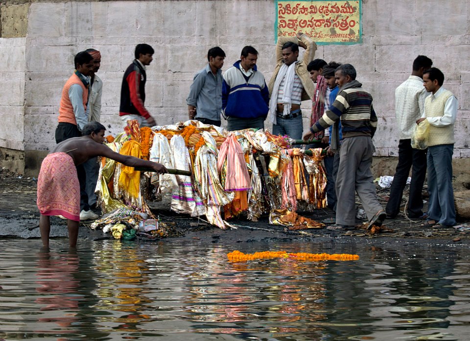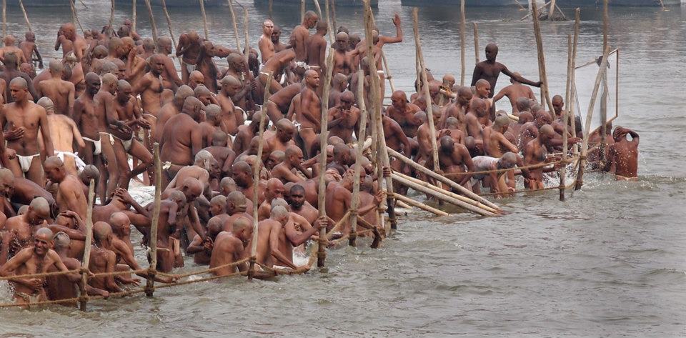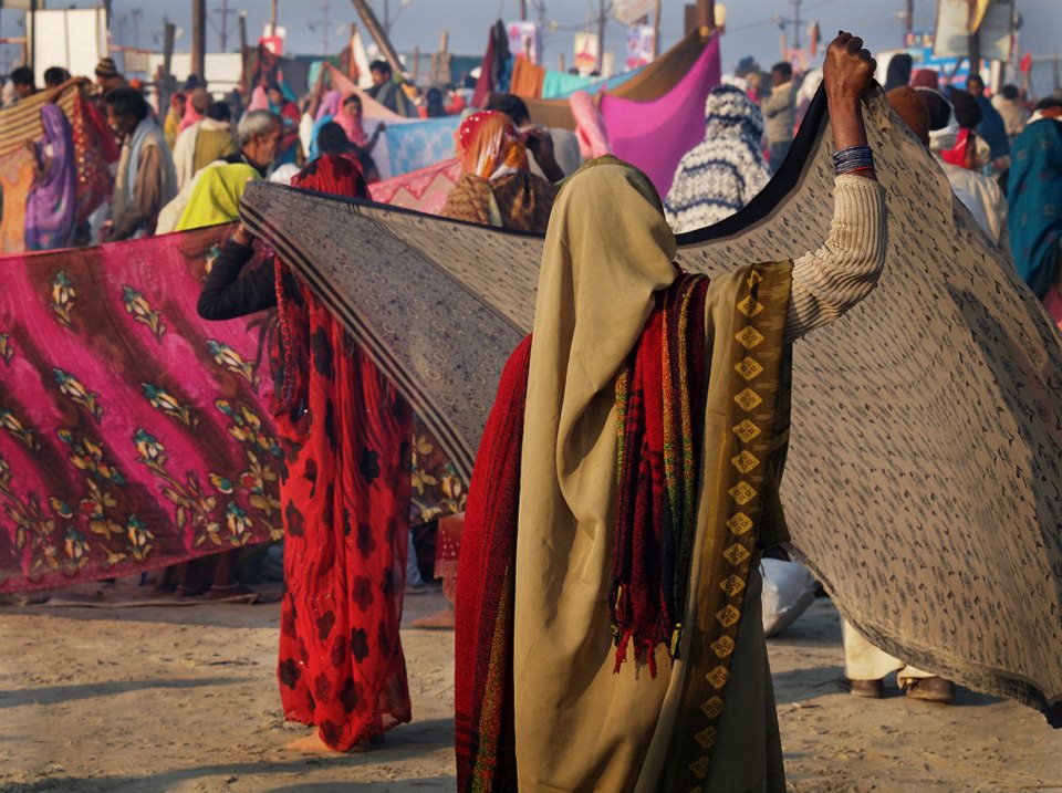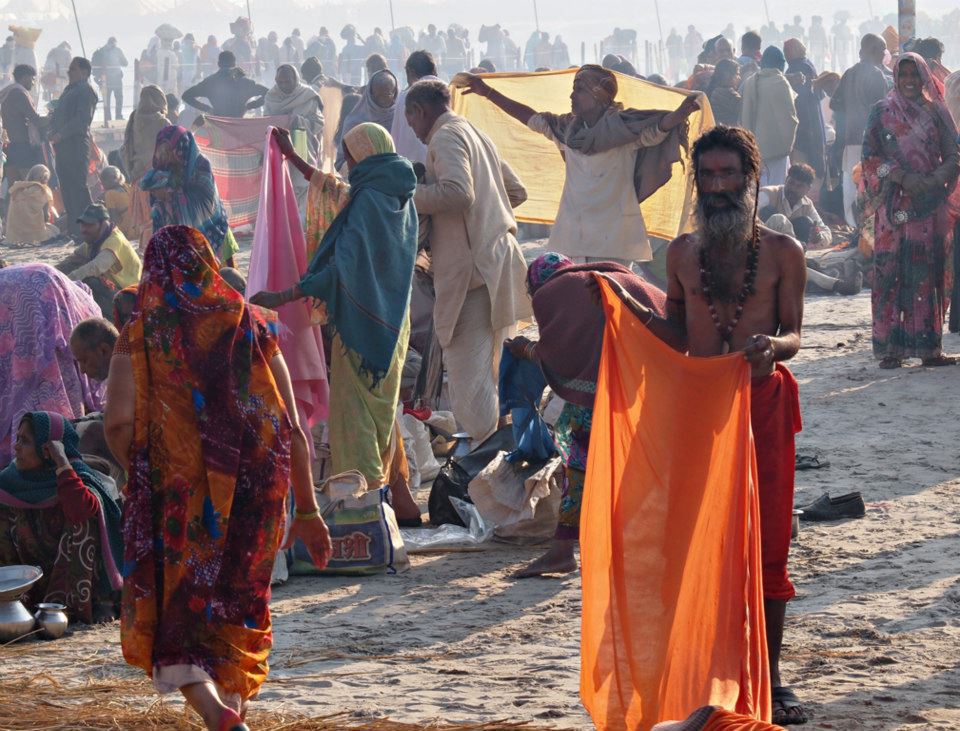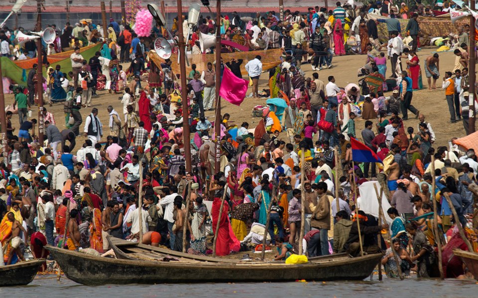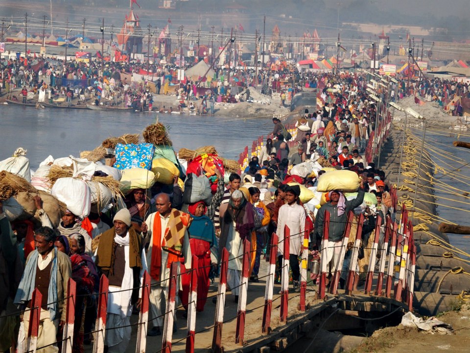 From Wikipedia: Kumbh Mela is a mass Hindu pilgrimage of faith in which Hindus gather to bathe in a sacred river. It is considered to be the largest peaceful gathering in the world, where around 100 million people were expected to visit during the Maha Kumbh Mela in 2013 in Allahabad. It is held every third year at one of the four places by rotation: Haridwar, Allahabad (Prayaga), Nashik and Ujjain. Thus the Kumbh Mela is held at each of these four places every twelfth year. Ardha (“Half”) Kumbh Mela is held at only two places, Haridwar and Allahabad, every sixth year. The rivers at these four places are: the Ganges (Ganga) at Haridwar, the confluence (Sangam) of the Ganges and the Yamuna and the mythical Saraswati at Allahabad, the Godawari at Nashik, and the Shipra at Ujjain. The name Kumbh Mela comes from Hindi, and in the original Sanskrit and other Indian languages it is more often known as Kumbha Mela. Kumbha means a pitcher and Mela means fair in Sanskrit. The pilgrimage is held for about one and a half months at each of these four places where it is believed in Hinduism that drops of nectar fell from the kumbha carried by gods after the sea was churned. Bathing in these rivers is thought to cleanse one of all sins.